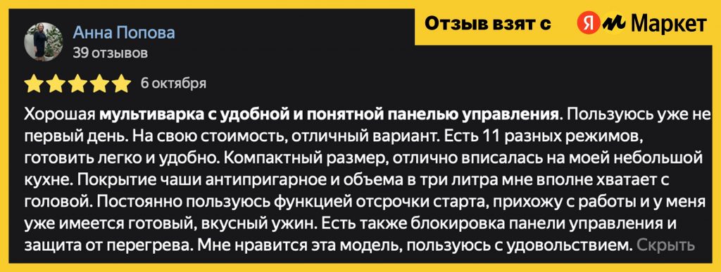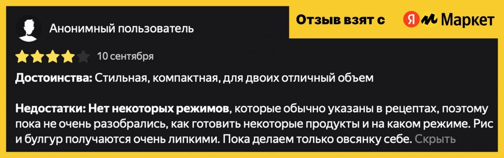 Объём чаши — 2 литра, поэтому прибор рассчитан на небольшие порции. Однако качество приготовления заметно выше среднего: каши получаются рассыпчатыми, тушёные блюда — насыщенными, а йогурт — густым и однородным.